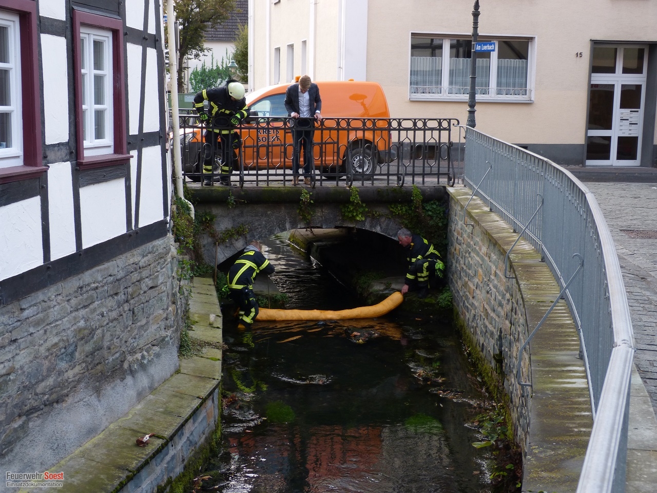 Durch eine Ölspur gelang Öl in den Soestbach. Wir haben die Ölspur abgestreut und Ölsperren im Soestbach ausgelegt.