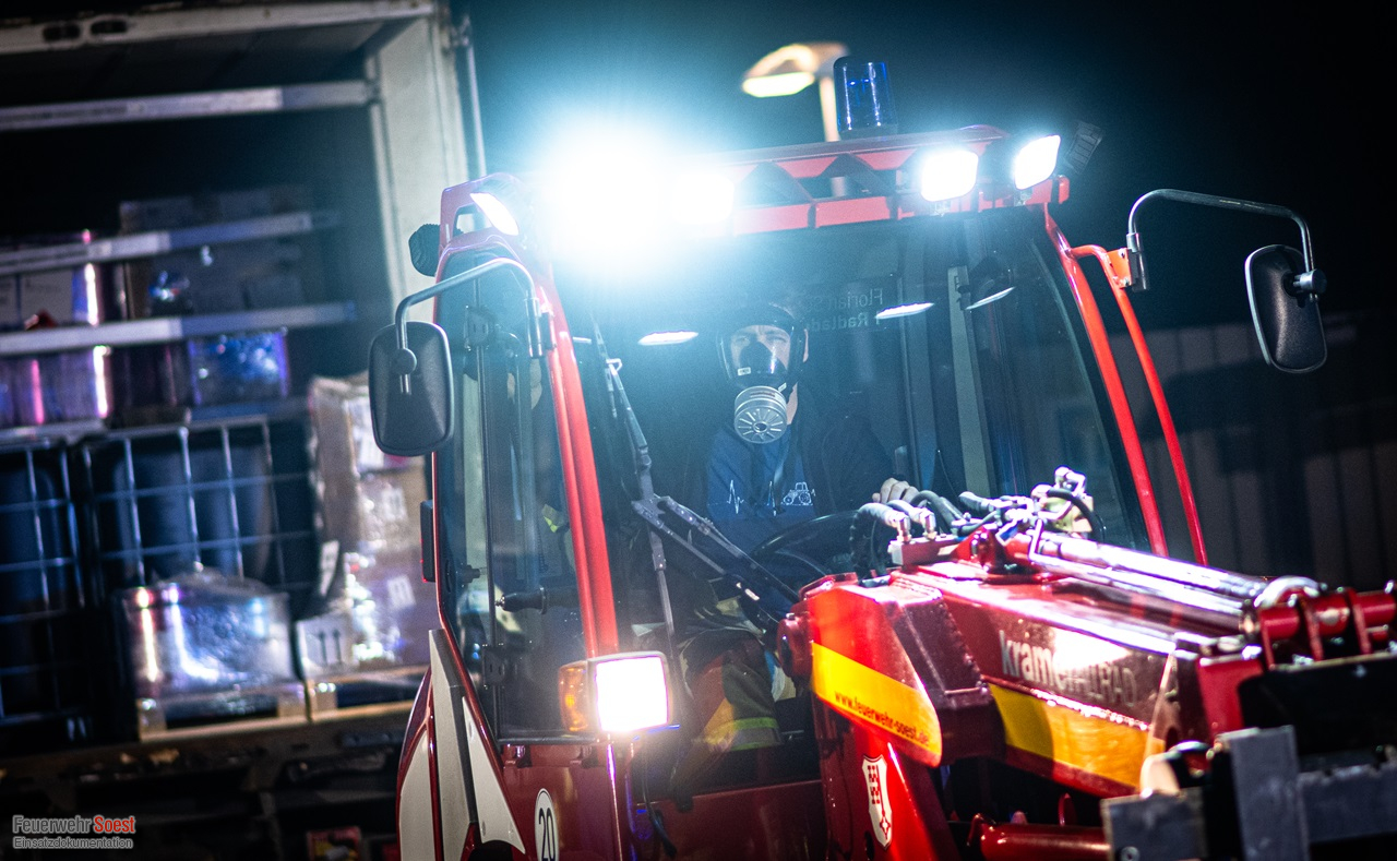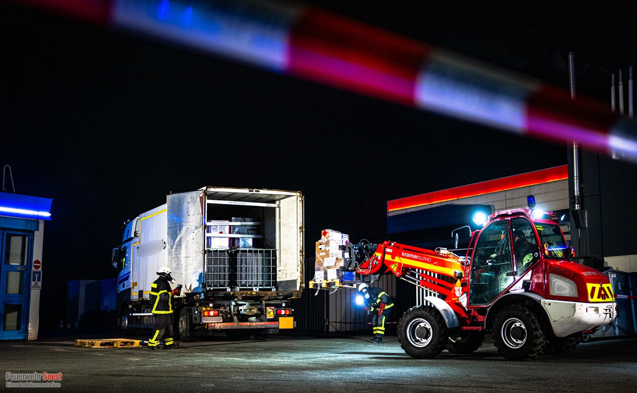 Der LKW wurde durch die Einsatzkräfte gesichert und in den speziell eingerichteten Bereich umgeparkt. Dort erfolgte die Entladung des betroffenen Stückguts mittels Telelader der Feuerwehr.