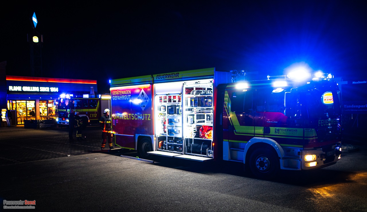 Am Dienstagabend wurde die Feuerwehr zu einem Einsatz im Overweg alarmiert. Aus einem Gefahrgut-LKW trat eine zunächst unbekannte Flüssigkeit aus. Beim Eintreffen begrenzte sich der austretende Stoff auf den betroffenen LKW, der sich im Bereich einer Tankstelle befand. Umgehend wurden Erkundungsmaßnahmen eingeleitet.