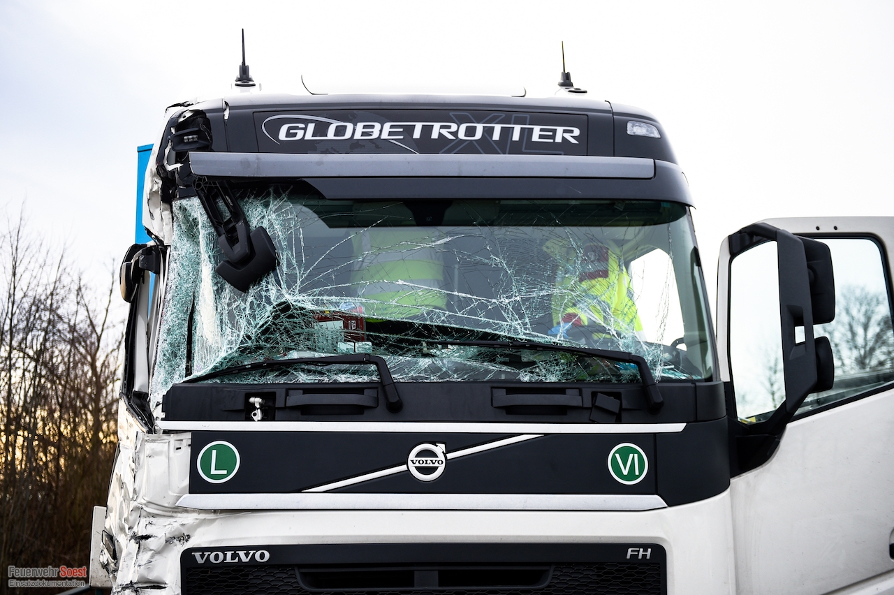 Bei einem Auffahrunfall mit zwei LKW, wurden zwei Personen verletzt. Die Maßnahmen der Feuerwehr beschränkten sich hier auf das Reinigen der Fahrbahn.