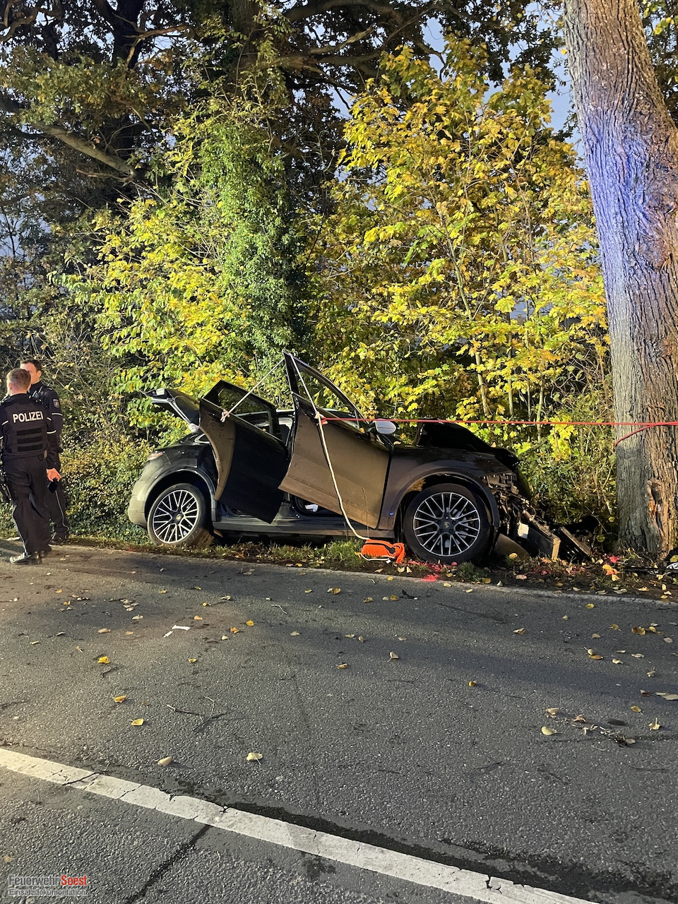 In Soest-Ruploh kam es zu einem Verkehrsunfall, bei dem ein Porsche Cayenne von der Fahrbahn abkam und frontal gegen einen Baum prallte. Der Fahrer wurde dabei in seinem Fahrzeug eingeschlossen und war nicht in der Lage, dieses selbstständig zu verlassen.